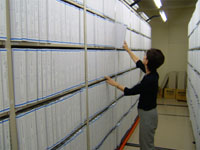 システム化に当たってデータ整備を行うため、平成13・14年度の2ヶ年に分け、国からの緊急地域雇用対策交付金を活用し、本庁地下書庫から公文書館、外部文書庫へと順次取り組みました。